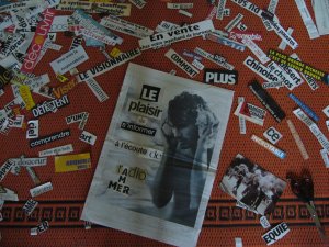 découvrit une pile de feuilles,  et des mots découpés-collés. Avec de la colle au poisson.  |